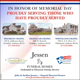 Jessen funeral homes, based in whiteland, indiana, is one of the leading funeral homes serving primarily johnson county and central indiana. Until service time friday at the funeral home. A funeral service will be conducted on saturday, may 29, 2021 at 1:00pm at jessen funeral home ~ franklin chapel, 197 e.